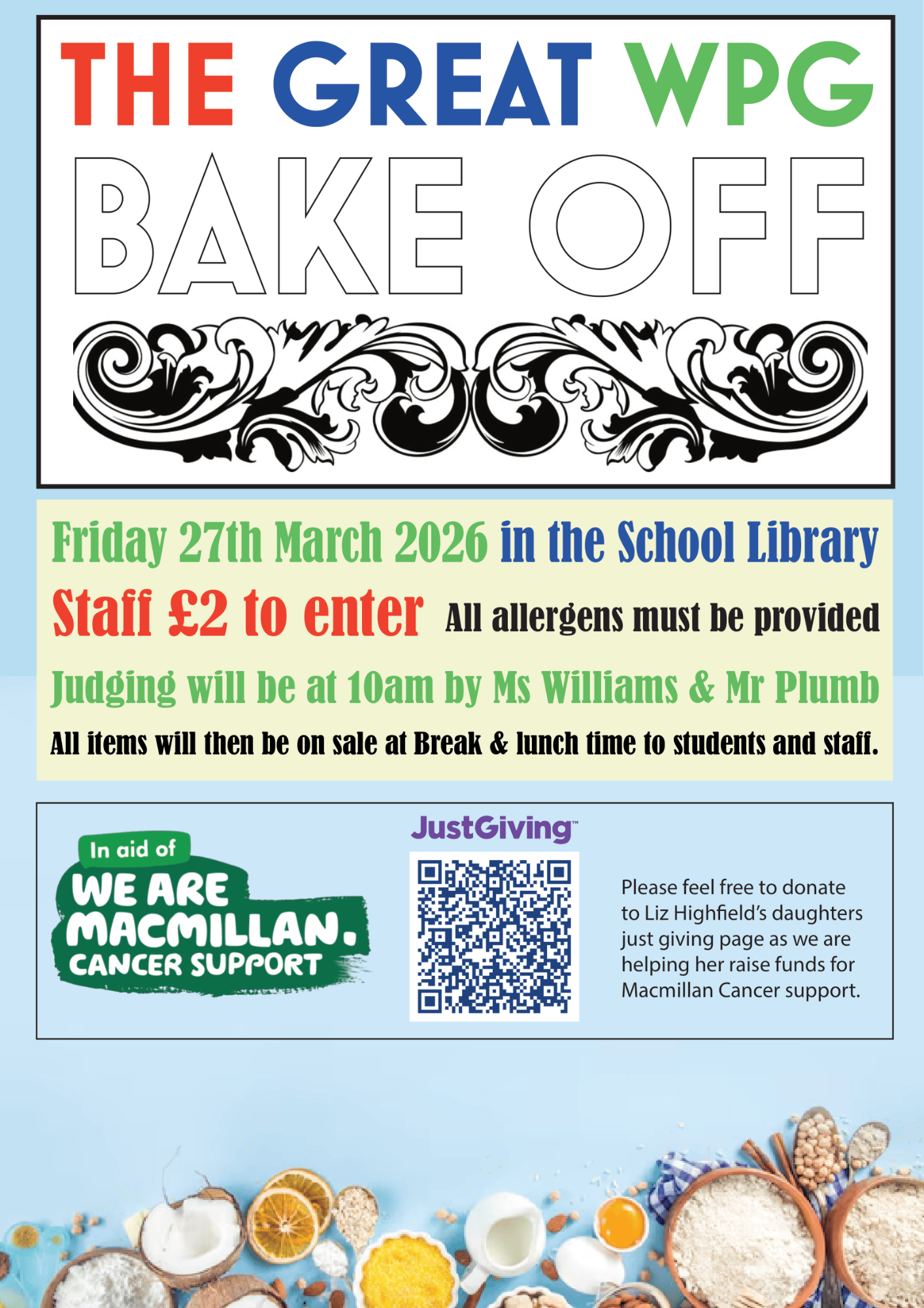 We are so excited to be hosting a whole‑school Bake Off and homemade cake sale this Friday 27th March, raising money for Macmillan Cancer Support