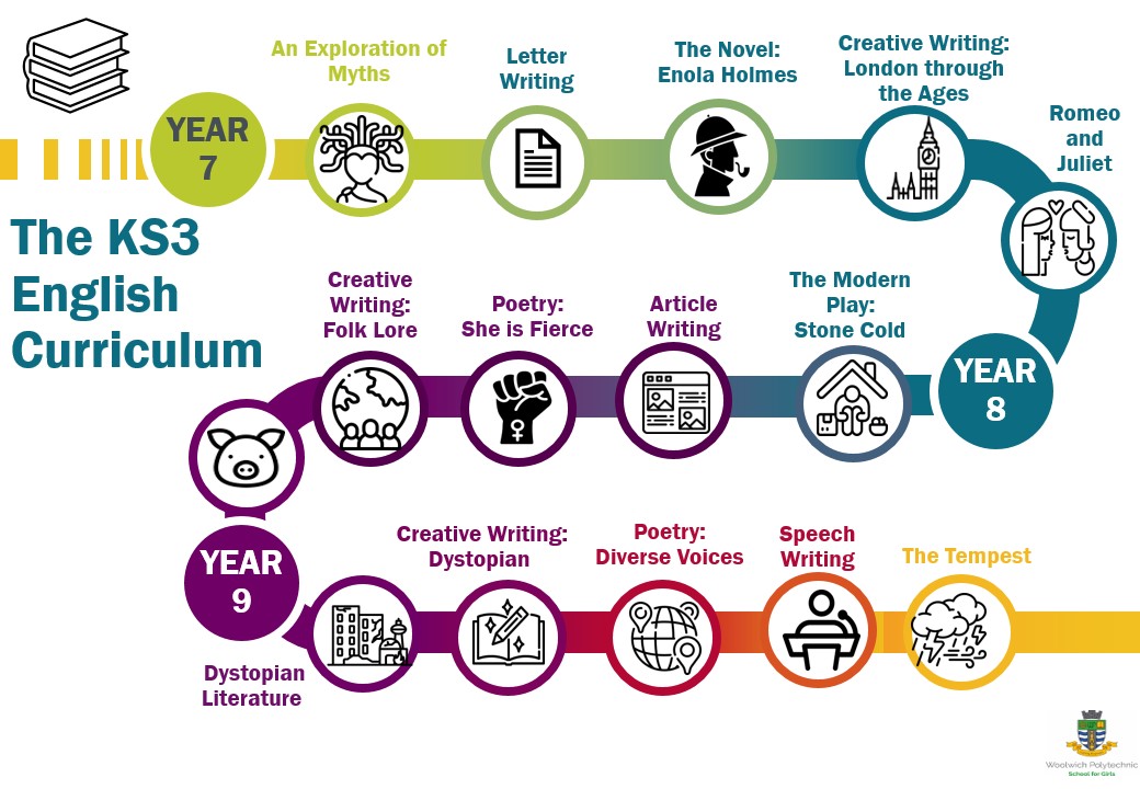 Our KS3 (years 7-9) curriculum is mapped backwards from the English Literature and English Language GCSE course so that we perfectly equip our girls with the correct skills which enable them to be successful in year 11. We are extremely proud of our rich, inclusive and engaging curriculum which has been constructed around the needs of our girls. This means that we begin teaching important skills such as language analysis and writing in year 7 so that they are ready to tackle the demands of their GCSEs in year 10. Our KS3 curriculum involves studying a diverse range of texts from a range of writers with different voices from a variety of cultural backgrounds as well as non-fiction and writing. Some of the exciting texts we study include ‘Animal Farm’, dystopian short stories, ‘Wolf Brother’, ‘The Tempest’ and ‘The Fire People’ poetry collection. We also ensure that we explicitly teach writing skills and so students will learn to write for different purposes: to argue, to persuade and to describe.