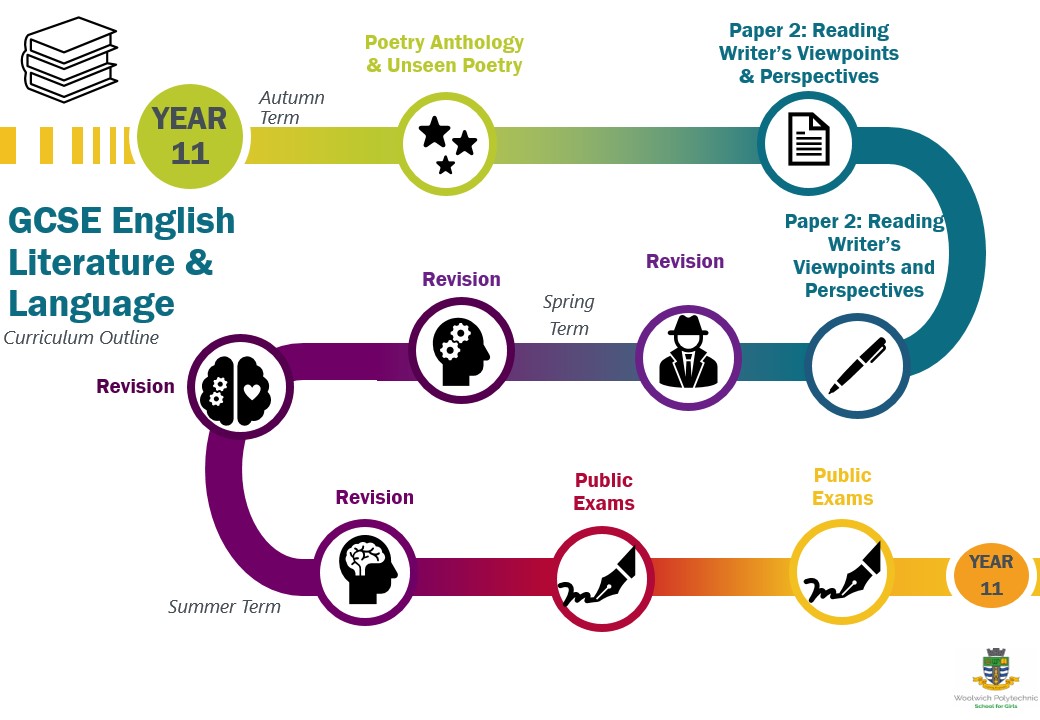 At the start of Year 11, students will complete the final Literature unit, which is the Power and Conflict Poetry Anthology and Unseen Poetry. Afterwards, the English Department works on exam skills to ensure that students are fully prepared for their GCSE exams. The English Department strives for success, so we offer a range of extra curriculum support from wave one intervention in the classroom, to a ‘Reaching for Success in English GCSE club as well as further intervention where necessary.